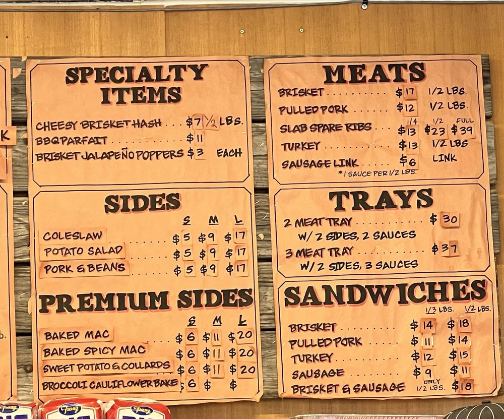 Full Slab of Pork Ribs, 1lb of Brisket, 1lb of Pulled Pork and 4 medium sides of your choice. Includes two 8 oz containers of sauces and house made pickles. Feeds 68.